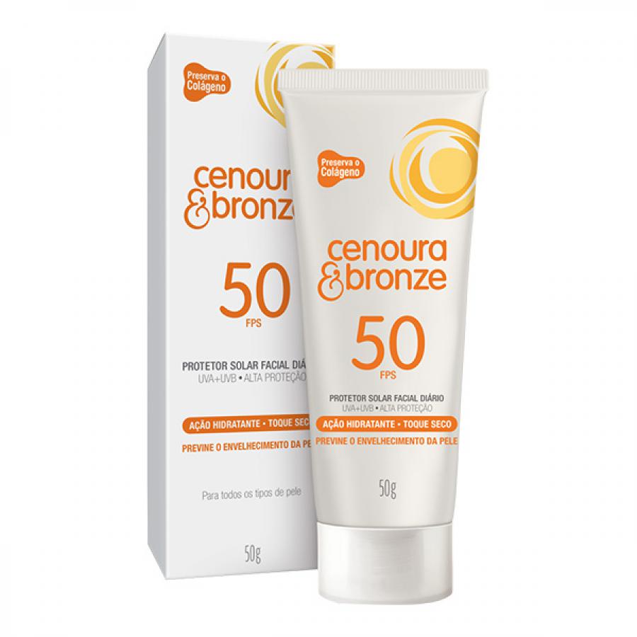 o Protetor Solar Facial Cenoura & Bronze FPS 50, toda a família protege a pele contra a ação dos raios solares e curte o verão, na praia, campo ou piscina, com muito conforto e segurança! Com fórmula exclusiva que resiste até 2 horas na água e tem toque seco com rápida absorção. Protege contra a vermelhidão, ardência e rugas causadas pela exposição solar, prevenindo o envelhecimento precoce e a perda de firmeza e elasticidade da pele do rosto. Oferece proteção contra os raios UVA, UVB e Infra-V.